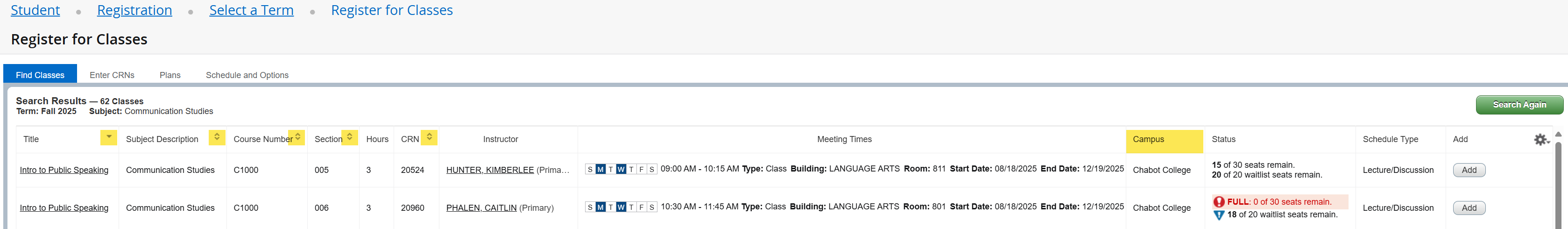 - Classes that have a waitlist will have waitlist information in the Status column.